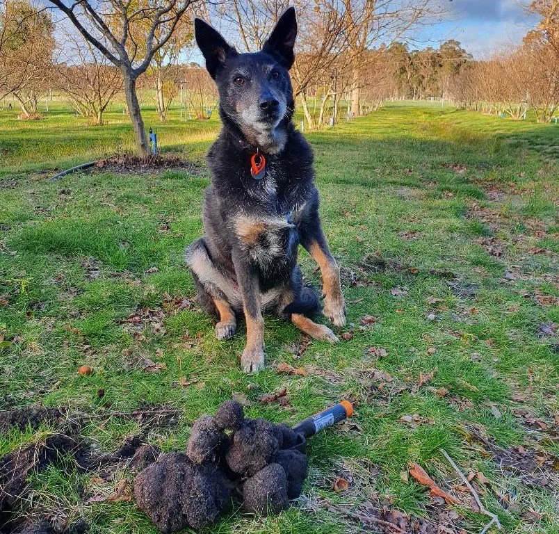 The truffles continue to ripen, their aroma intensifying as they mature. Their alluring scent attracts a range of local fauna and also our specially trained truffle-hunting dogs. Twice a week at peak harvest, our canine companions lead us on a treasure hunt, their noses guiding us to the hidden gems. Each truffle is carefully unearthed, inspected, and only the perfectly ripe ones are harvested, washed by hand, and later meticulously graded to ensure the highest quality.